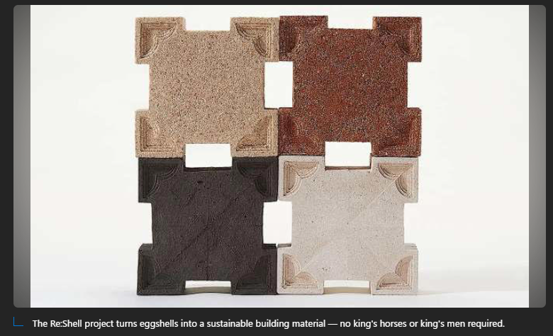 - A South Korea–based initiative called Re:Shell is transforming discarded eggshells into a sustainable construction material.