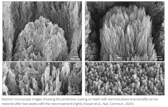 - Tests show that the regenerated enamel is mechanically similar to healthy enamel, withstanding brushing, chewing, and acidic foods.