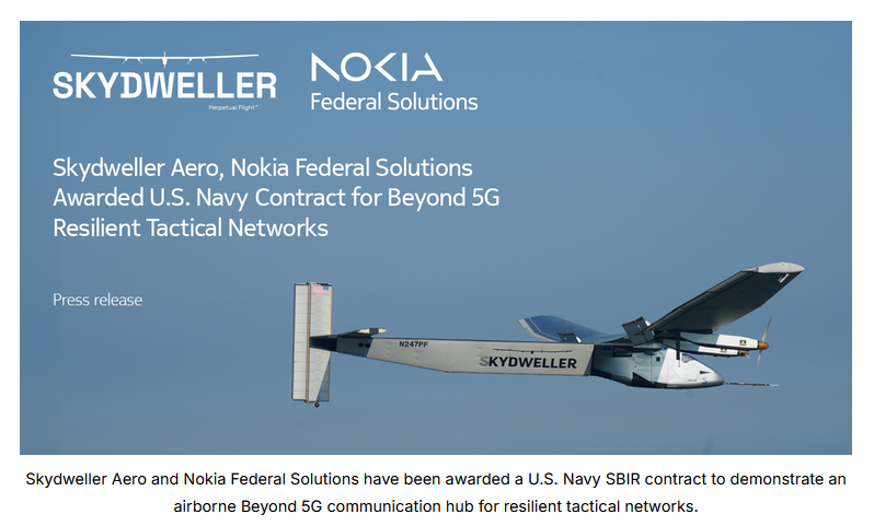 - Oklahoma-based Skydweller Aero and Nokia Federal Solutions Inc. have received a US Navy Small Business Innovation Research contract to demonstrate a [perpetual] airborne 5G communication hub designed for secure, resilient networks in contested environments.