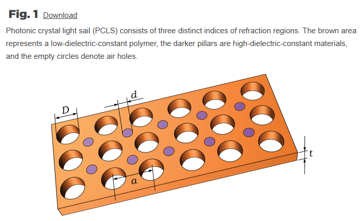 Research paper here: https://www.spiedigitallibrary.org/journals/journal-of-nanophotonics/volume-19/issue-04/046008/Design-and-manufacture-of-a-photonic-crystal-light-sail/10.1117/1.JNP.19.046008.full