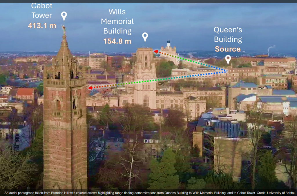 - The team measured the distance between two buildings on campus—Queens Building and Wills Memorial Building—about 155 meters apart.