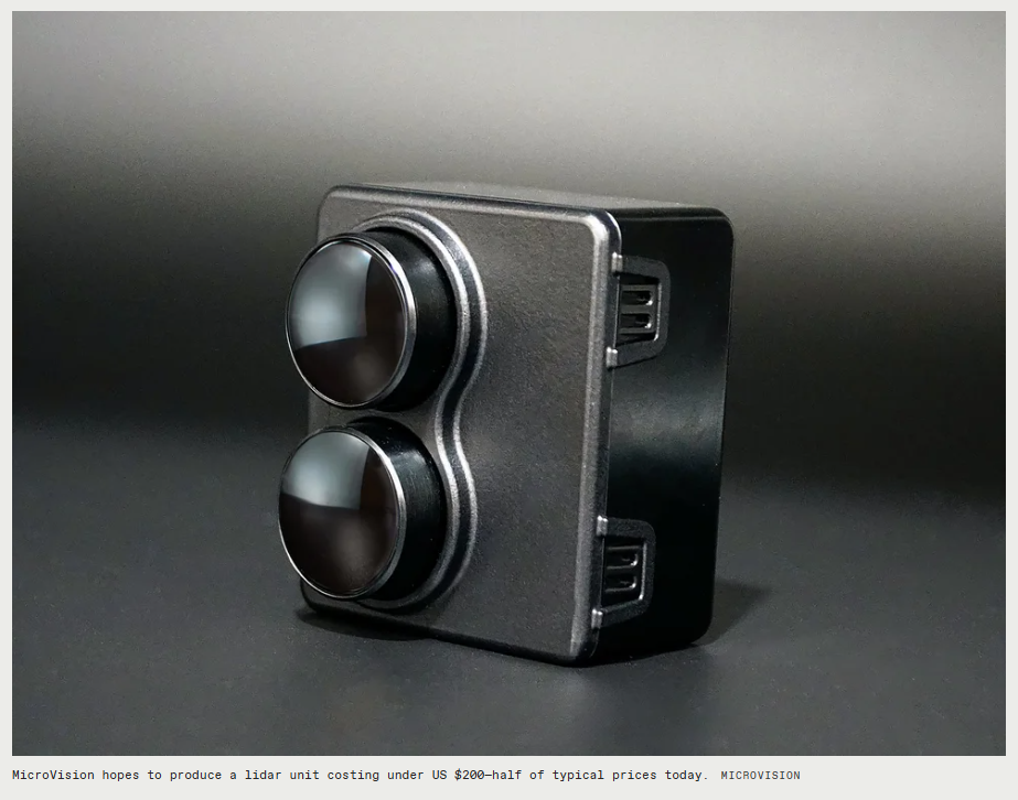 • Now, companies like MicroVision [a solid-state sensor technology company located in Redmond, Washington] are developing solid-state lidar units targeting a mass-production price point of under $200, with a long-term goal of hitting $100 per sensor.