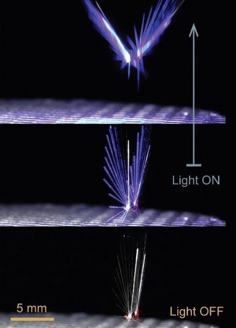 • This means that light can be used to change the shape of the tiny dandelion seed-like structure. The fairy [flying robot] can adapt manually to wind direction and force by changing its shape. A light beam can also be used to control the take-off and landing actions of this polymer assembly.